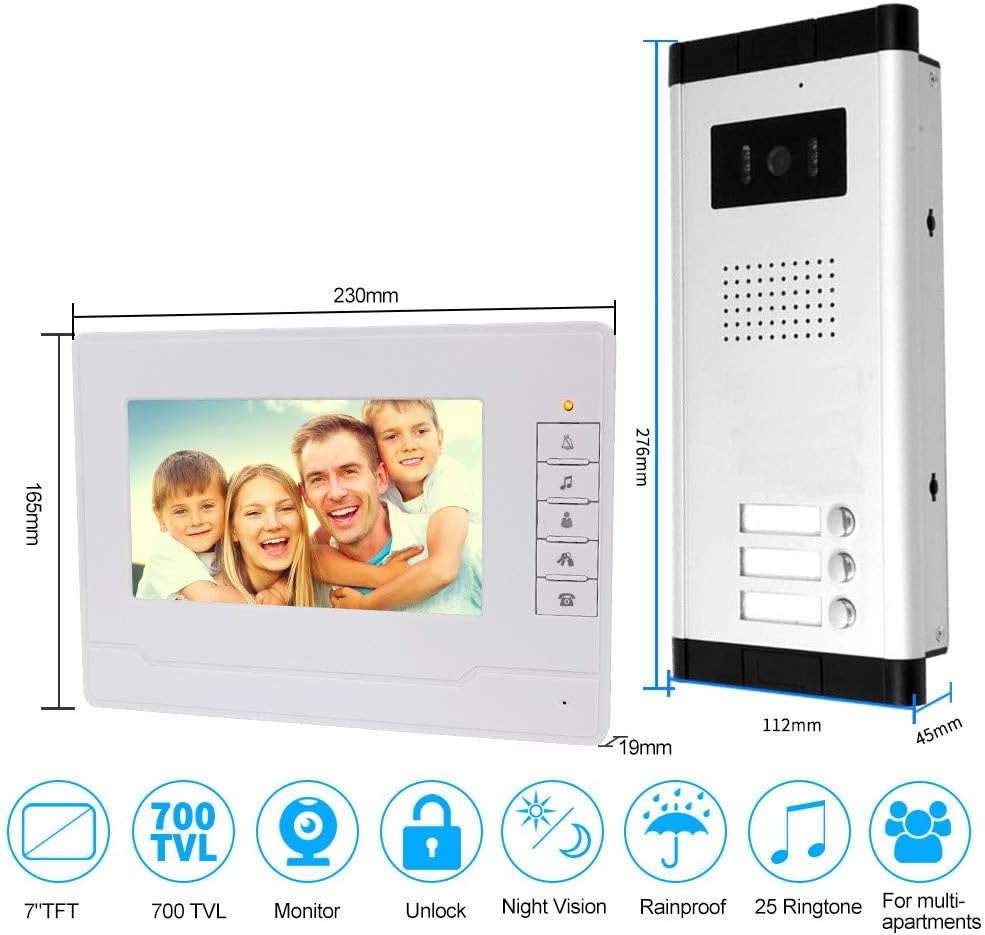 - 1 camera and 3 LCD colour monitors support 1 building with 3 households. You can see and hear before you are at the door.